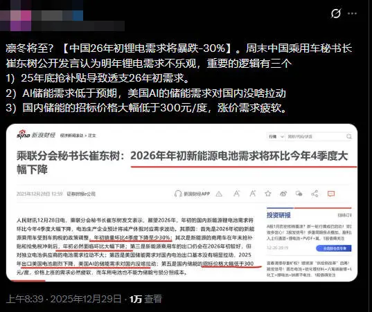 凛冬将至?乘联分会秘书长:中国2026年初锂电需求将暴跌30%