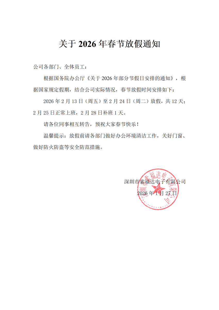 根据国务院办公厅《关于2026年部分节假日安排的通知》,根据国家规定假期,结合公司实际情况,春节放假时间安排如下: