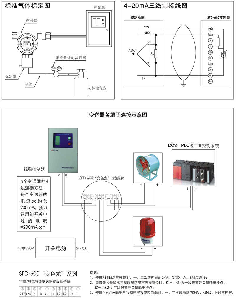 Associated apparatus: SFD-860 Series alarm controller、SFD-300 alarm controller、SFD Multi-functional sound and light alarm、PLC or DCS industrial centralized control system, the ordinary computer (need to add related software)